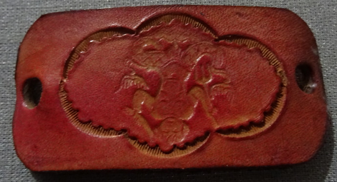 Haarspange aus rötlich braunem Echt-Leder mit eingestanztem Wassermann, umgeben von eingestanzten WellenMaße: 7,2 cm x 3,5 cmguter Zustand