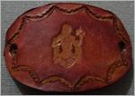 Haarspange aus rot-braunem Echt-Leder mit eingestanztem weiblichen Wesen und gestanzten, gewellten OrnamentenMaße: 8 cm x 5 cmwie NEU