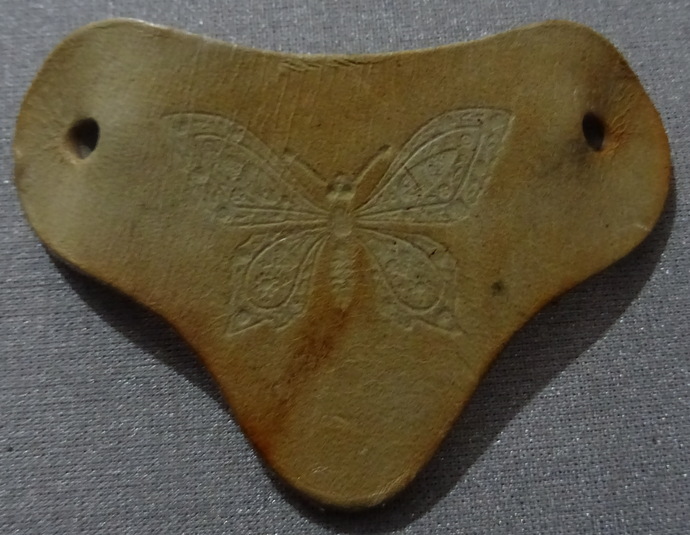 Haarspange aus beigefarbenem Echt-Leder mit eingestanztem SchmetterlingMaße: 10 cm x 6,5 cmguter Zustand