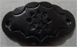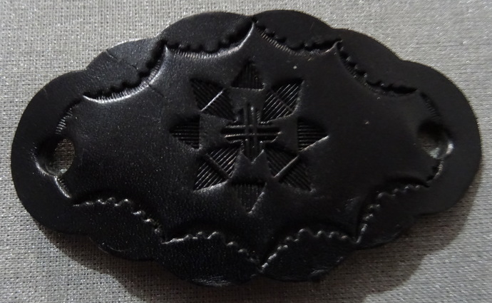 Haarspange aus schwarzem Echt-Leder mit eingestanztem Stern mit Kreuz und gewelltem RandMaße: 9 cm x 5 cmguter Zustand