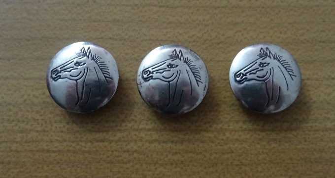 Knopfaufsatz-Setsilberfarbenmit Pferdeköpfen verziertMaß: 2 cm Durchmesserguter Zustand