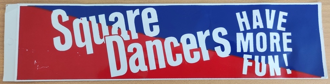 SD Zeichen mit Aufschrift "Square Dancers - HAVE MORE FUN!"weiße Schreift auf rot-blauem GrundMaße:300 x 75 mm